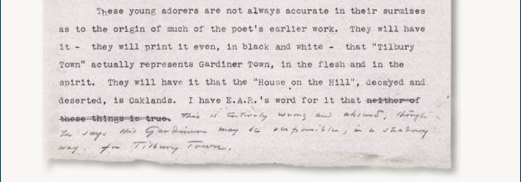 “They will have it — they will print it even, in black and white — that ‘Tilbury Town’ actually represents Gardiner Town, in the flesh and in the spirit. They will have it that the ‘House on the Hill,’ decayed and deserted, is Oaklands. I have E. A. R.’s word for it that this is entirely wrong and absurd, though he says that Gardiner ‘may be responsible, in a shadowy way, for Tilbury Town.’”