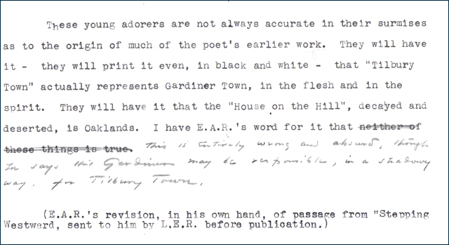 This paragraph appeared in Laura E. Richards, Stepping Westward (New York and London: D. Appelton and Company, 1931), Chapter XI, “A Posey of Friendship,” pages 377-383. Because of the raging controversy about Gardiner, Maine, being the basis of the Tilbury Poems, Laura Richards floated a trial balloon and asked the poet for his explanation. Robinson crossed out the words “neither of these things is true” and inserted at the end of the paragraph: “This is entirely wrong and absurd, though he says that Gardiner may be responsible, in a shadowy way, for Tilbury Town.”
