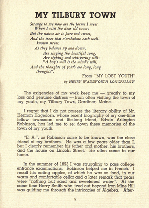 My Tilbury Town was privately printed in 1938 by James Stewart Barstow in response to the publication of Herman Hagedorn’s biography of Edwin Arlington Robinson. Because this publication was issued in a limited edition and now is available only at libraries with special collections devoted to Robinson, scanned images of the pages in this brief pamphlet are offered in this website.