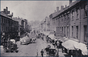 This view looks west on the middle section of Water Street in 1896. The sign "F.M. Noyes" appears over the pharmacy that the poet's brother, Dean Robinson, bought in 1897.