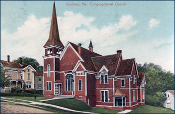 Edward and Mary Robinson worshiped at the Gardiner Congregational Church, and young Robinson and his brothers were known to slip out of Sunday School to enjoy warm summer days. In 1889-90, the Congregationalists remodeled their 1839 meetinghouse on Brunswick Avenue into this picturesque Queen Anne-style church. Edwin E. Lewis of Gardiner served as architect for the changes. The building was destroyed by fire in 1915, and its site is now occupied by a convenience store.